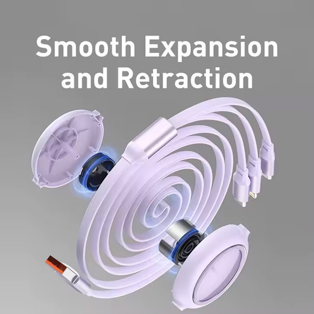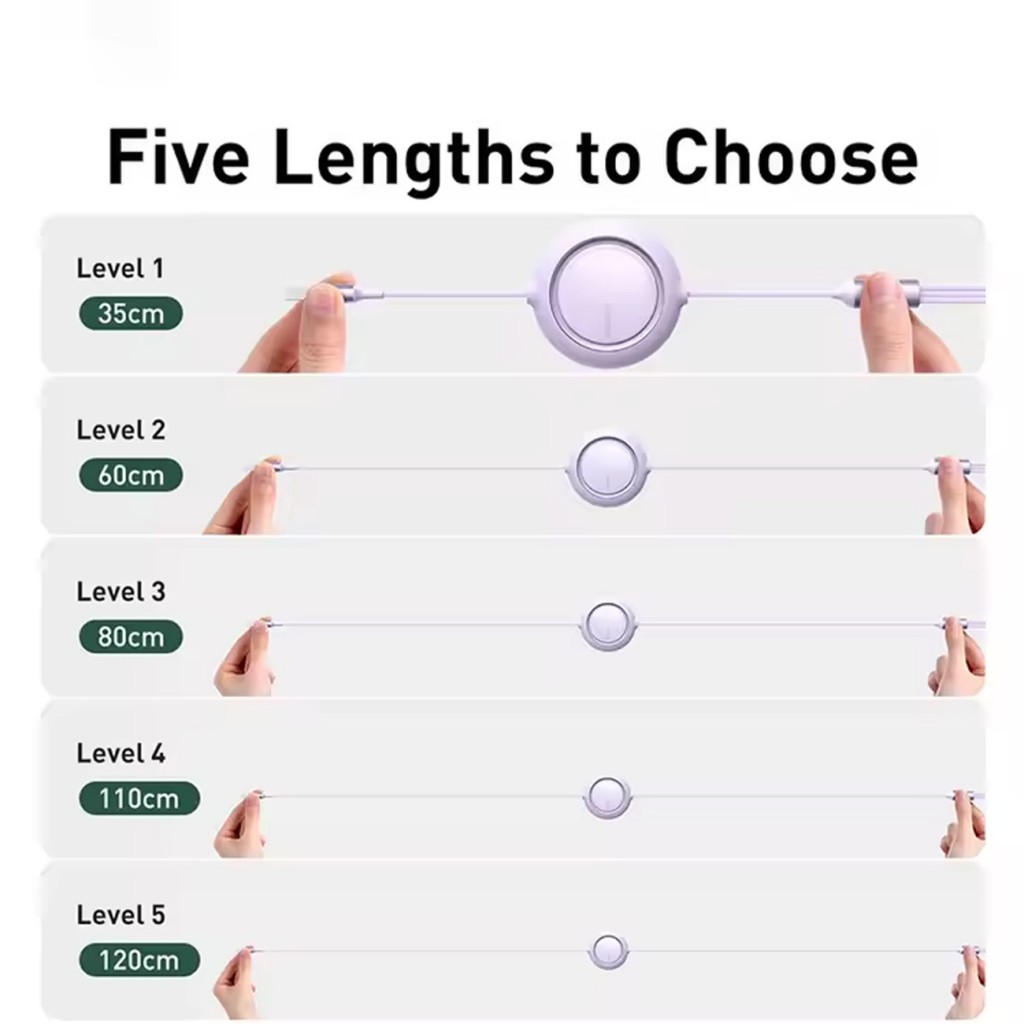 کمپانی بیسوس در طراحی این کابل سه سر شارژ بسیار هوشمندانه و خلاق عمل کرده بطوری که سه شارژر را در یک محصول ارائه داده است . این کابل درون قاب فلزی و گرد زیبایی جا گرفته که به واسطه ی یک قرقره دارای سیستم جمع شونده خودکار است که حجم بسیار کمی را اشغال کرده و حمل و جابه جایی آن را ساده میکند . علاوه بر این میتوانید در 5 طول مختلف تنظیم کنید : 120 سانتی متر، 110 سانتی متر، 80 سانتی متر، 60 سانتی متر و 35 سانتی متر ؛ تنها کاری که باید انجام دهید این است که کابل را از دو طرف بکشید . این کابل از روکش محافظ بسیار با کیفیت ساخته شده است که در برابر سایش و خمیدگی مقاوم است که طول عمر بالای آن را تضمین میکند.